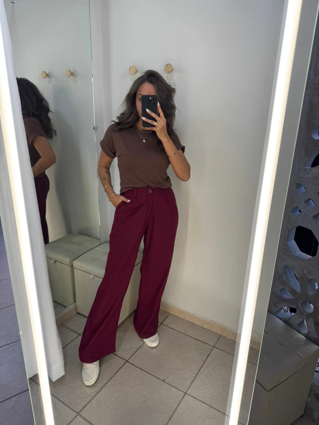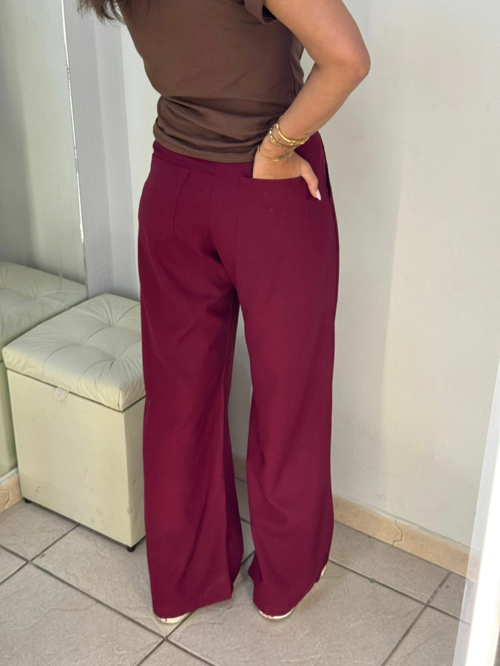 Descubra a elegância da Calça Pantalona Ju na cor cereja, com um sofisticado botão em marrom que realça sua beleza. Esta peça clássica é confortável e elegante, perfeita para quem deseja um look impecável.