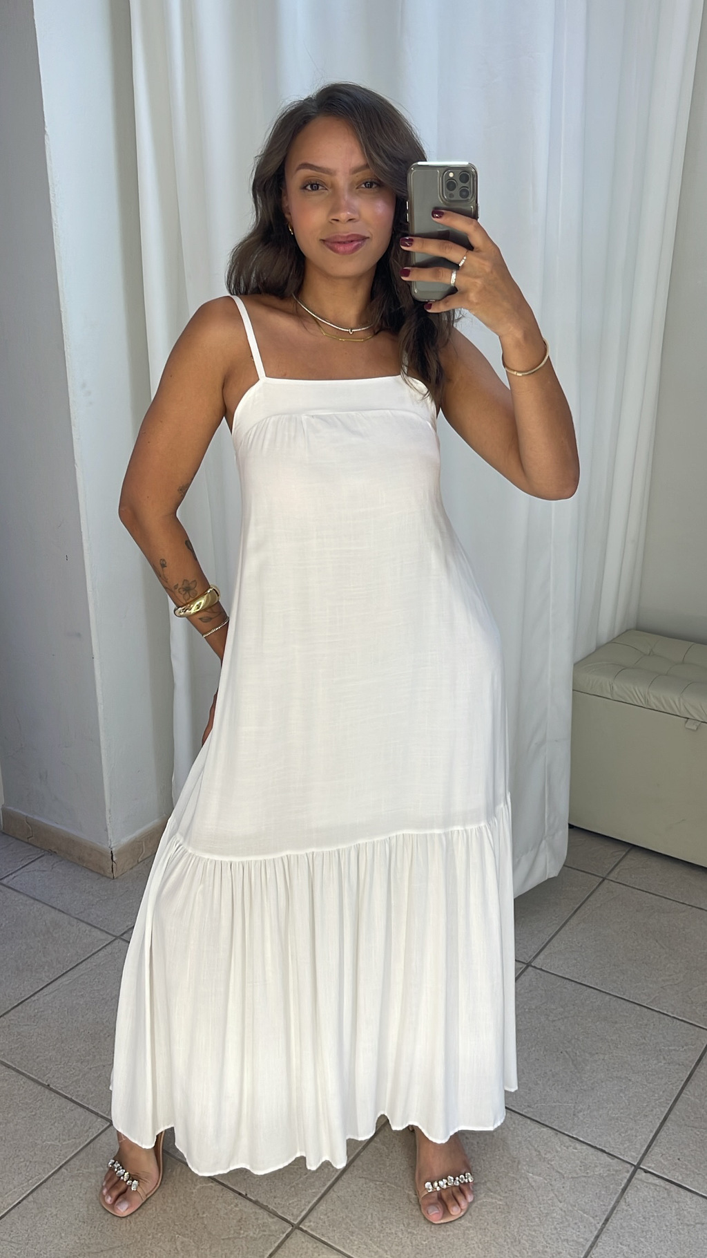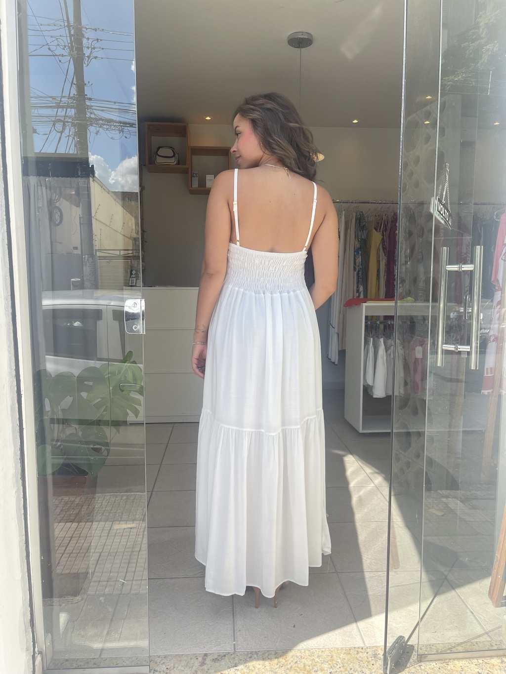 O vestido Jasmim possui alças ajustáveis e lastex nas costas, adaptando-se facilmente a diferentes corpos e tamanhos.